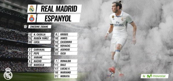 وعرفت القائمة تواجد الويلزي غاريث بيل الغائب عن الفريق منذ مدة بسبب الإصابة، وقال زيدان بخصوص عودته: "بيل أصبح معنا بالفريق وأفكر بالدفع به لدقائق في مواجهة الغد أمام إسبانيول، أنا سعيد بعودته لأنه قطعة مهمة في الفريق"، فيما تعرف القائمة غياب العديد من الأسماء، على غرار القائد سيرجيو راموس، متوسط  الميدان لوكا مودريتش، بالإضافة إلى الحارس كارلوس نافاس و المهاجم كريم بن زيمة، وفيما يلي القائمة المعنية بمواجهة إسبانيول: