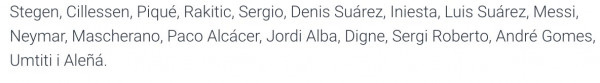 و أعلن المدرب لويس أنريكي عن القائمة المعنية بهذه المواجهة، حيث عرفت تواجد أبرز نجوم "البلاوغرانا" أبرزهم ثلاثي الهجوم،  ليونيل ميسي، لويس سواريز و نايمار دا سيلفا، فيما سيغيب كل من توران، فيدال و رافينيا بسبب الإصابة، بالإضافة إلى المدافع ماتيو والحارس ماسيب لقرار فني.