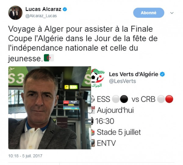 وكان ألكاراز قد أكد صبيحة اليوم عبر صفحته الرسمية على "التويتر" أنه سيكون حاضرا في مدرجات 5 جويلية لمتابعة هذا العرس الكروي، بين وفاق سطيف و شباب بلوزداد.