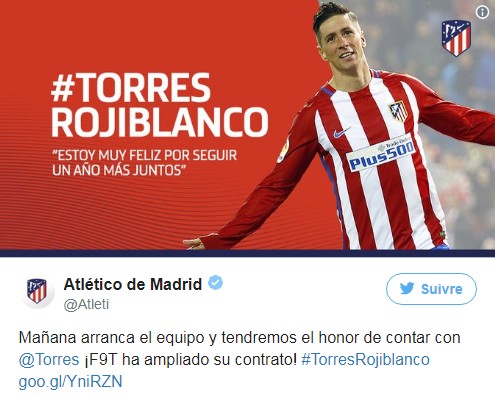 حيث نشر النادي الإسباني بيانا عبر موقعه الرسمي، أكد من خلاله أن توريس وقع على عقد جديد مع الفريق يمتد إلى غاية 2018، وكان المهاجم الإسباني من دون فريق منذ أن إنتهى عقده مع "الروخي بلانكوس" في جوان الماضي، لتقرر الإدارة إعادته إلى الفريق خاصة وأنه يعد واحدا من خريجي هذا النادي، قبل أن يغادره في 2007 وينضم إلى ليفربول، ليعود إليه من جديد موسم 2016/2015 على شكل إعارة من ميلان الإيطالي، قبل أن يقوم أتليتيكو مدريد بشراء عقده عام بعد ذلك.