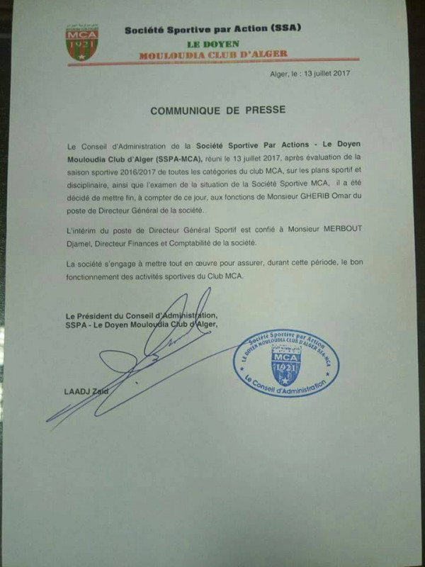 حيث نشر مجلس إدارة الشركة الرياضية برئاسة زايد لاج بيانا اليوم الخميس، أكد من خلاله أنه تم إنهاء مهام عمر غريب من منصب المدير العام بصفقة نهائية، وسيخلفه في هذا المنصب السيد مربوط جمال مدير المحاسبة المالية في النادي العاصمي.