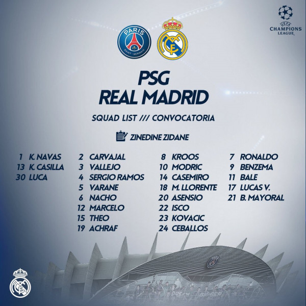 وهذا من أجل مواجهة باريس سان جيرمان غدا في لقاء العودة من الدور الـ 16 لمنافسة دوري أبطال أوروبا، وعرفت القائمة تواجد جميع اللاعبين وهو ما يجعل النادي الملكي بأفضلية عكس النادي الفرنسي الذي سيحرم من نجمه الأول نايمار، وحملت القائمة أسماء كل من: نافاس، كاسيا، لوكا، كارفاخال، فابيخو، راموس، مارسيلو، فاران، ناتشو، حكيمي، ثيو هيرنانديز، كروس، مودريتش، كازيميرو، لورينتي، أسينسيو، إيسكو، كوفاسيتش، سيبايوس، رونالدو، بايل، بن زيمة، فاسكيز ومايورال.