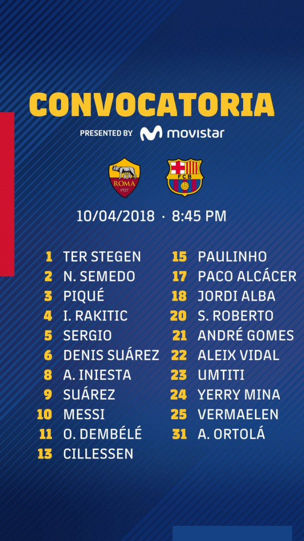 وأعلن إرنستو فالفيردي مدرب برشلونة عن القائمة المعنية بمواجهة روما هذا الثلاثاء في إياب ربع نهائي دوري أبطال أوروبا، والتي شهدت تعدادا مكتملا تقريبا للاعبي الفريق الأول، حيث سيكون الاستثناء الوحيد غياب الظهير الأيسر لوكاس دين بسبب عدم تعافيه من الإصابة، فيما يغيب فيليبي كوتينيو أيضا غير المعني بمسابقة دوري أبطال أوروبا، فيما سيعود سيرجيو بوسكيتس إلى القائمة بعد غيابه عن مواجهة ليغانيس أمس السبت.