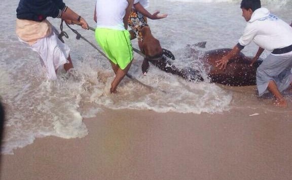 ويظهر في الفيديو أبقارًا حية تتقاذفها الأمواج قرب شاطئ رأس الحد في سلطنة عمان، في حين يعمل بعض الشبانعلى مساعدتها للوصول إلى "بر الأمان".