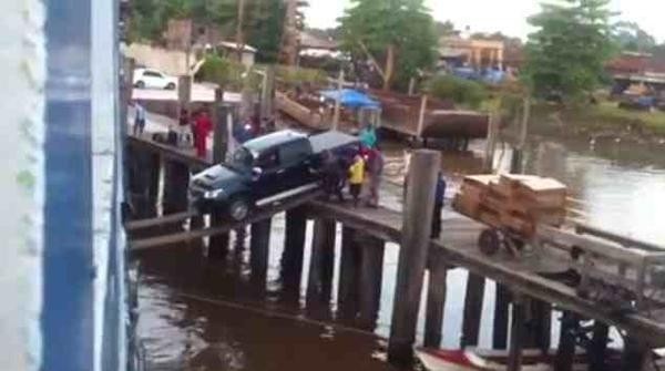 وحسب صحيفة "الديلي ميل" البريطانية، كان السائق يريد وضع السيارة على مركب شحن، ولم يجد أمامه سوى عارضتين خشبيتين.