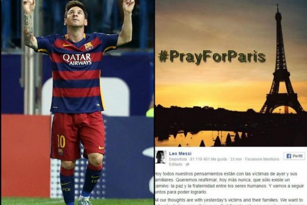 بعث ليونيل ميسي مهاجم برشلونة الإسباني، رسالة تضامن ودعم من خلال الشبكات الاجتماعية للشعب الفرنسي عقب هجمات باريس التي راح ضاحياه أكثر من 128 قتيلا حسب الإعلام الفرنسي لحد الآن، وكتب "البرغوث": "هناك مسار واحد فقط هو السلام".