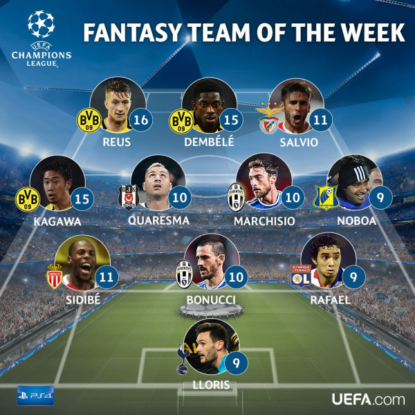 كشف موقع الإتحاد الأوروبي عن تشكيلة الأسبوع لمسابقة دوري أبطال أوروبا، والتي عرفت تواجد ثلاثة لاعبين من بوروسيا دورتموند، وهم ماركو رويس، موسى ديمبيلي و شينجي كاغاوا، ولاعبين من جوفنتوس هما كلاوديو ماركيزيو، وليوناردو بونوتشي.