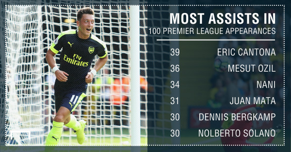 خاض مسعود أوزيل نجم أرسنال اليوم مباراته رقم 100 في مسيرته في الدوري الإنجليزي، ولم تمر هذه المناسبة على النجم الألماني حتى سجل رقما جديدا أضافه إلى رصيده، إذ أصبح صانع ألعاب "الغينيرز" ثاني أفضل ممرر حاسم في أول 100 مباراة برصيد 36 تمريرة حاسمة بعد تمريرة اليوم لزميله جيرو، إذ يتفوق عليه فقط نجم مانشستر يونايتد السابق إيريك كانتونا الذي قدم 39 تمريرة حاسمة في أول 100 مباراة له في "البريمرليغ".