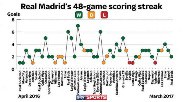 واصل ريال مدريد تحقيق أرقام كبيرة وحقق فوزا ثمينا على ضيفه ريال بيتيس بنتيجة هفين لواحد، وأشارت الأرقام والإحصائيات أن "الريال" تمكن من تسجيل أهداف في 48 مباراة على التوالي في جميع المسابقات منذ شهر أفريل 2016، محققا 34 انتصارا 11 تعادلا و3 هزائم في هذه الفترة التي سجل خلالها 133 هدفا وتلقت شباكه 55 هدفا.