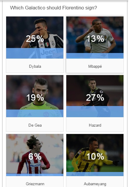 أجرت صحيفة "ماركا" الإسبانية استفتاءا لجماهير ريال مدريد لمعرفة هوية النجم الذي تود رؤيته في الفريق الصيف القادم، واقترحت الصحيفة المقربة من بيت النادي المدريدي 6 أسماء لامعة ويتعلق الأمر بكل من باولو ديبالا، كيليان مبابا، دافيد دي خيا، إيدين هازارد، أنطوان غريزمان وبيير إيمريك أوباميونغ، وصوتت جماهير "الميرينغي" للتعاقد مع هازارد نجم تشيلسي بنسبة 27 % من الأصوات فيما اختار ما نسبته 25 % ضم بالو ديبالا نجم جوفنتوس.