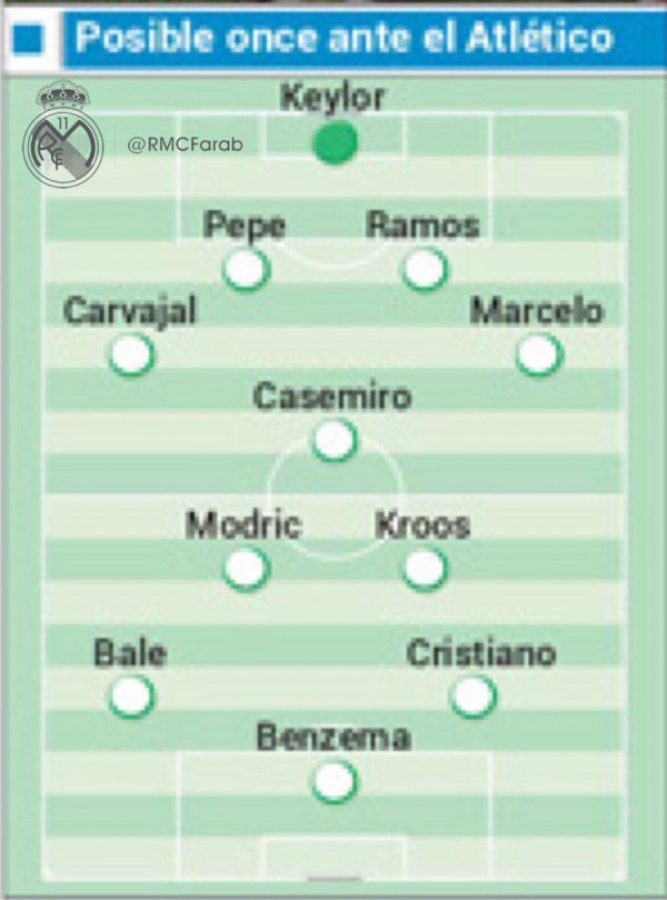 يواجه ريال مدريد جاره أتليتيكو مدريد ضمن إطار الجولة 32 من الدوري الإسباني، في مواجهة ستكون صعبة على زملاء كريستيانو رونالدو والذين سيعملون على تفادي أي نتيجة سلبية قد يستغلها الملاحق برشلونة من أجل خطف صدارة الترتيب، وكشفت بعض الصحف الإسبانية عن التشكيلة المتوقعة التي سيدخل بها زين الدين زيدان هذا اللقاء والتي جاءت كما يلي: