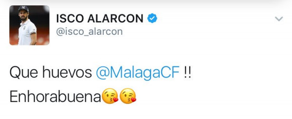 هنأ إيسكو نجم ريال مدريد فريقه السابق مالاغا بعد أن حقق فوزا كبيرا على برشلونة بهدفين دون رد في الجولة 31 من الدوري الإسباني، وهي الخسارة التي سمحت لـ الريال بتوسيع الفارق في الصدارة بفارق 3 نقاط عن الملاحق برشلونة، مع أفضلية مباراة متأخرة لزملاء إيسكو أمام سيلتا فيغو.