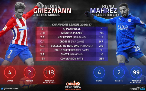 يتنقل ليستر سيتي إلى العاصمة الإسبانية مدريد لمواجهة الأتليتي، في مواجهة ستتركز عليها الأنظار صوب نجوم الفريقين، وأبرزهم الدولي الجزائري رياض محرز من جانب "الثعالب" و الفرنسي أنطوان غريزمان من جانب "الروخي بلانكوس"، وسنقدم لكم إحصائية توضح أرقام كل لاعب في مسابقة دوري أبطال وروبا هذا الموسم: