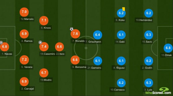 أصدر موقع "هو سكورد" المختص في الأرقام ولاإحصائيات تقييمه الخاص بلاعبي ريال مدريد وأتلتيك ومدريد في الشوط الأول من المباراة، وكان كريسيتانو رونالدو صاحب أفضل علامة في المرحلة الأولى بـ 7.6 بعد أن سجل الهدف الوحيد إلى حد الآن.