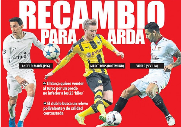 كشفت صحيفة"موندو ديبورتيفو" الكتالونية أن إدارة برشلونة تفكر جديا في التخلي عن أردا توران نجم خط وسط الفريق، وأشارت ذات الصحيفة أن "البارصا" سيبيع نجمه التركي بمبلغ لا يقل عن 25 مليون أورو، مضيفة في ذات الوقت أن مسؤولي النادي الكتالوني جهزوا قائمة تضم 3 أسماء سيعوض أحدها توران في حال تأكد رحيله، ويتعلق الأمر بكل من ماركو رويس نجم بوروسيا دورتموند، أنخيل دي ماريا نجم باريس سان جيرمان وفيتولو مهاجم إشبيلية.