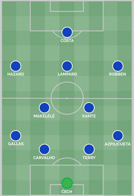 بيتر تشيك، سيزار أزبيلكويتا، جون تيري، ريكاردو كارفاليو،  ويليام غالاس، كلود ماكيليلي، نغولو كانتي، فرانك لامبارد، أريين روبين، إيدين هازارد ودييغو كوستا.