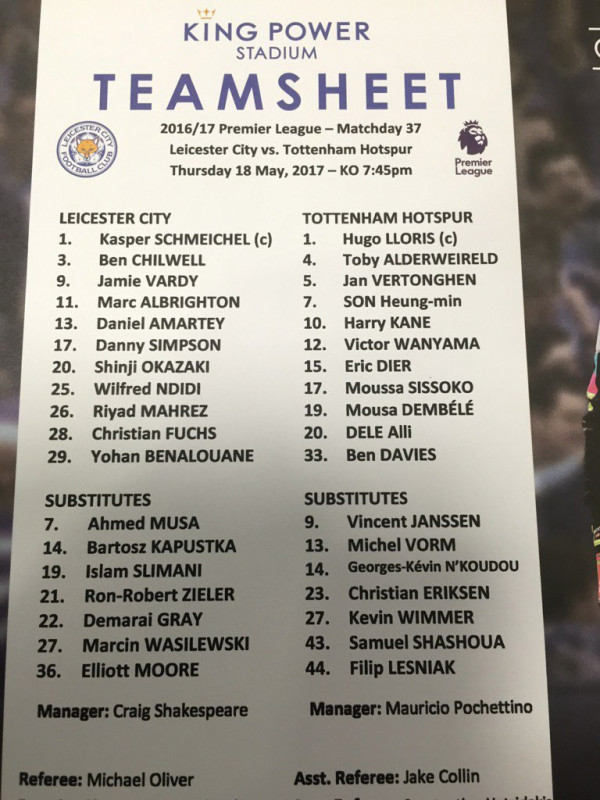 ليستر سيتي: شمايكل، سيمبسون، بن علوان، فوكس، بن شيلوال، أماراتي، نديدي، ألبرايتون، محرز، أوكازاكي، فاردي.