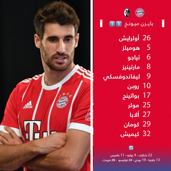 أعلن المدرب العائد لبايرن ميونيخ يوب هاينكس عن التشكيلة الأساسية التي سيدخل بها مواجهة فرايبورغ، والتي تدخل ضمن إطار الجولة الثامنة من الدوري الألماني، حيث عرفت عودة توماس مولر بعد أن كان حبيس دكة البدلاء في عهد المدرب السابق كارلو أنشيلوتي، وفيما يلي التشكيلة الأساسية: