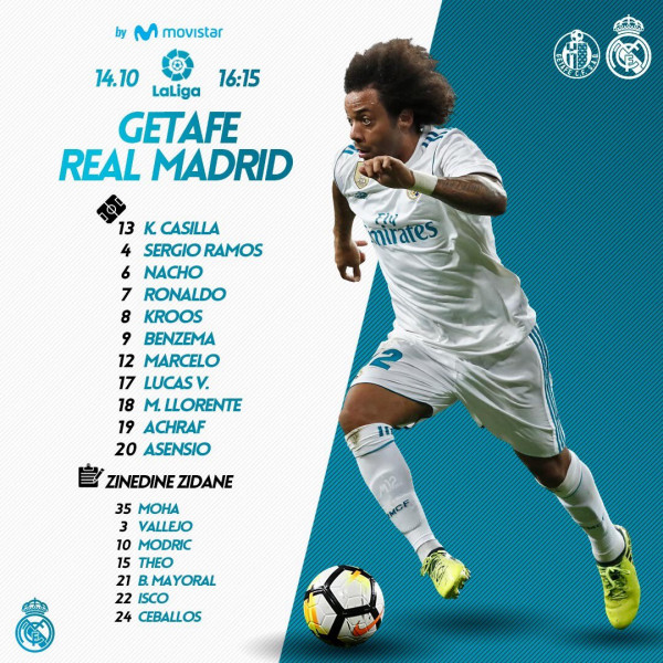يواجه ريال مدريد جاره خيتافي في داربي مصغر، وهذا ضمن إطار الجولة الثامنة من الدوري الإسباني، وأعلن المدرب زين الدين زيدان عن التشكيلة الأساسية التي سيعتمد عليها في هذا اللقاء، والتي جاءت كما يلي: