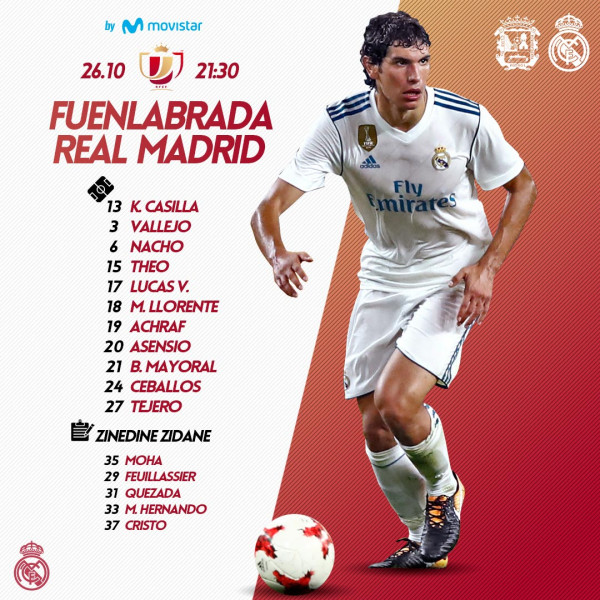 يواجه ريال مدريد مضيفه فوينلابرادا ضمن إطار كأس الملك، في مواجهة إستبعد فيها المدرب زين الدين زيدان جميع العناصر الأساسية، حيث فضل الإعتماد على العناصر الإحتياطية وبعض اللاعبين من الفريق الثاني، وفيما يلي التشكيلة الأساسية التي سيدخل بها "الميرنغي" هذا اللقاء: