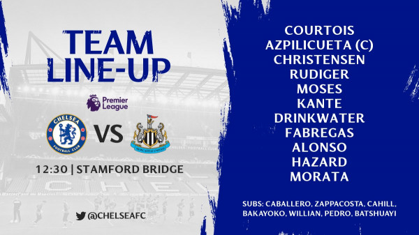 يواجه تشيلسي ضيفه نيوكاسل ضمن إطار الجولة 14 من الدوري الإنجليزي الممتاز وأعلن الإيطالي أنطونيو كونتي عن التشكيلة الأساسية التي سيدخل بها هذا اللقاء والتي جاءت كما يلي: كورتوا، أزبيليكويتا، كريستينسين، روديغير، موزيس، كانتي، درين واتر، فابريغاس، الونسو، هازارد، موراتا.
