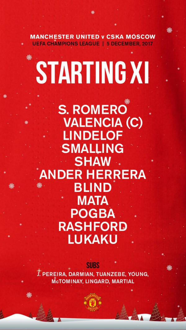 يواجه مانشستر يونايتد نادي سيسكا موسكو، وهذا ضمن إطار الجولة الأخيرة من دور المجموعات لمسابقة دوري أبطال أوروبا، وكشف البرتغالي جوزي مورينيو عن التشكيلة الأساسية التني سيدخل بها "الشياطين الحمر" هذا اللقاء، والتي جاءت كما يلي: روميرو، فالنسيا، ليندلوف، سمالينغ، شاو، هيريرا، بليند، بوغبا، ماتا، راشفورد، لوكاكو.