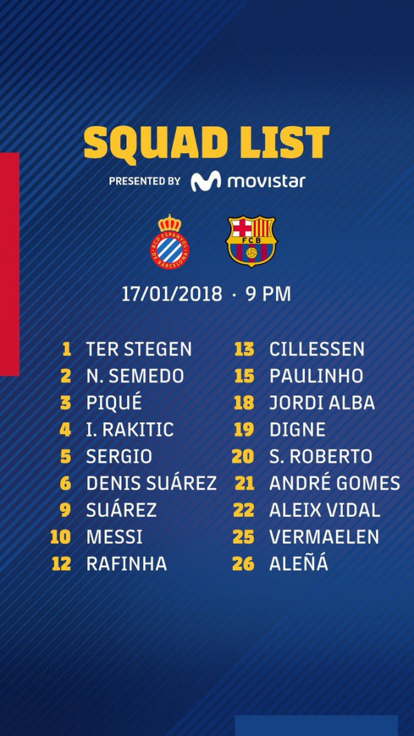 أعلن أرنستو فالفيردي مدرب برشلونة عن قائمة الفريق المعنية بمواجهة الغد أمام إسبانيول في ربع ذهاب نهائي كأس ملك إسبانيا، والتي شهدت عودة نيلسون سيميدو بعد غيابه عن مواجهة ريال سوسيداد بسبب المرض، فيما سيغيب كل من إنييستا، ماسكيرانو، أومتيتي، ديمبيلي، كوتينيو وألكاسير بسبب الإضابة، كما استُبعد الثنائي ديولوفيو وييري مينا لخيارات فنية.
