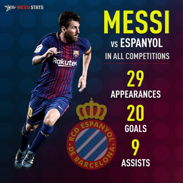 يلتقي برشلونة أمام جاره إسبانيول في إياب ربع نهائي كأس ملك إسبانيا، حيث يسعى النادي الكاتلوني إلى تدراك هزيمة الذهاب بنتيجة 1-0، ويعد إسبانيول من الأندية المفضلة للنجم الأرجنتيني ليونيل ميسي، أين واجههم في 29 مباراة في جميع المسابقات، سجل في شباكهم 20 هدفا وقدم 9 تمريرات حاسمة.