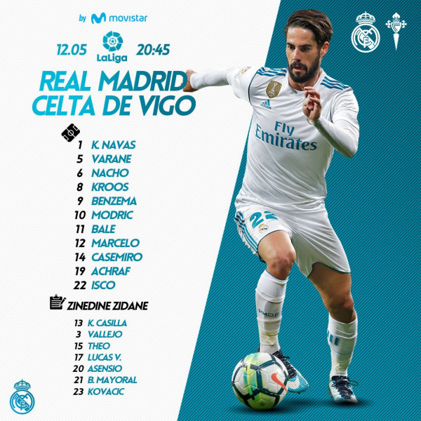 أعلن زين الدين زيدان مدرب ريال مدريد عن التشكيلة الأساسية التي ستواجه سيلتا فيغو على ملعب "سنتياغو بيرنابيو بداية من الساعة 19.45، والتي شهدت مفاجأة بعودة نجم خط الوسط إيسكو ليشارك لأول مرة بعد الإصابة التي تعرض لها في مباراة ذهاب نصف نهائي دوري الأبطال أمام بايرن ميونيخ، وفيما يلي التشكيلة الأساسية: