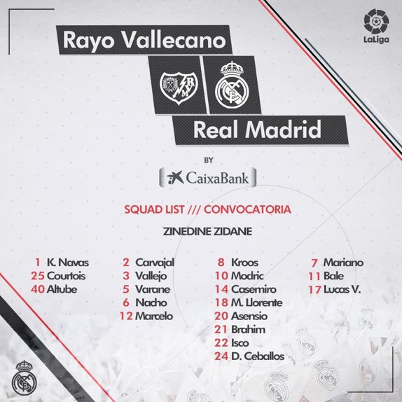 أعلن زين الدين زيدان مدرب ريال مدريد، عن قائمة الفريق المعنية بخوض مواجهة رايو فايكانو سهرة الأحد في الدوري الإسباني، حيث عرفت غياب الهداف الفرنسي كريم بن زيمة بسبب الإصابة، إضافة إلى سيرجيو راموس وأودريوزولا اللذان يتواصل غيابهما بداعي الإصابة كذلك، وأبعد "زيزو" كلا من فينيسيوس جونيور، ريغيلون وفالفيردي لأسباب فنية.