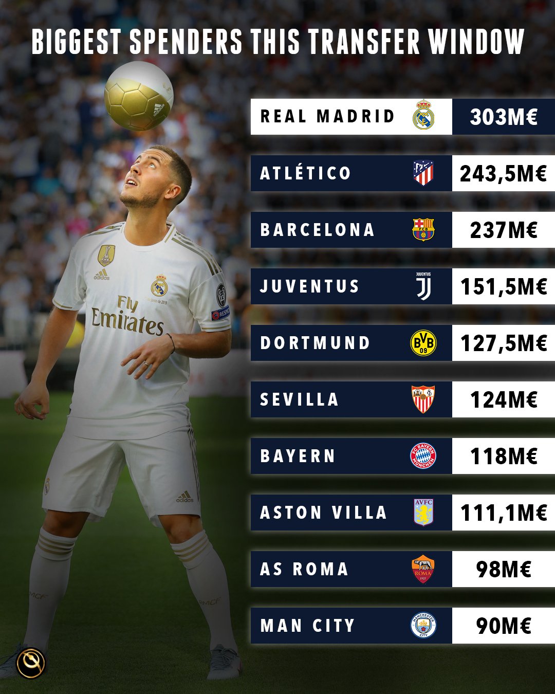 تنفق الأندية الأوروبية الملايين والملايير في كل مرة يتعلق بها الأمر بسوق الانتقالات، في سبيل تعزيز صفوفها لأجل التنافس على الألقاب، وبعد مرور أيام عن فتح سوق الانتقالات الصيفية 2019، نجد بأن ريال مدريد هو الأكثر إنفاقا حتى الآن بمجموع صفقات تبلغ 303 مليون أورو، ثم يأتي بعده جاره أتلتيكو مدريد وبعدهما برشلونة، لكن اللافت في قائمة أكثر الأندية إنفاقا حتى الآن، وجود الصاعد الجديد إلى الدوري الإنجليزي الممتاز وهو أستون فيلا الذي أنفق إلى غاية الآن 111 مليون أورو، أكثر من أي ناد إنجليزي آخر.